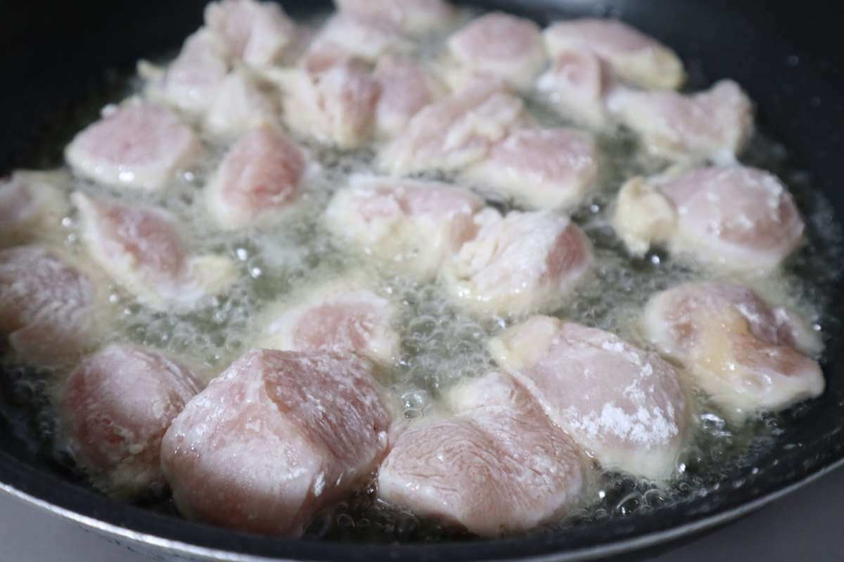 鶏むね肉に片栗粉をまぶして、180度の油できつね色になるまで揚げる。