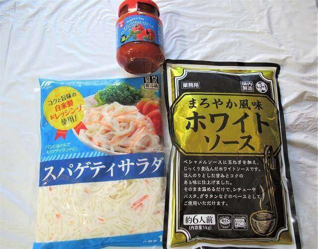 あまりに簡単すぎてすみません……。スパゲティサラダ・ホワイトソース・トマトソースに、それぞれ味つけがされているため、その他の味を足す必要はありません。