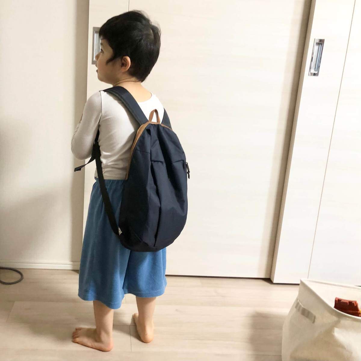 今回ご紹介する10ℓのリュックは、4歳児が背負うとこんな感じに。