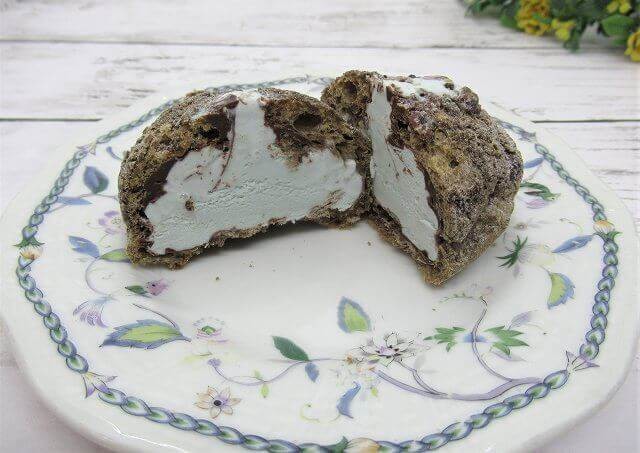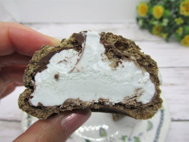 断面をみてみると、ココアシューパフにクッキー生地が乗り、ミントアイスの周りにはチョコレートがコーティングされています。