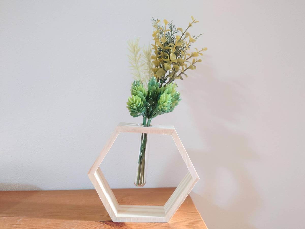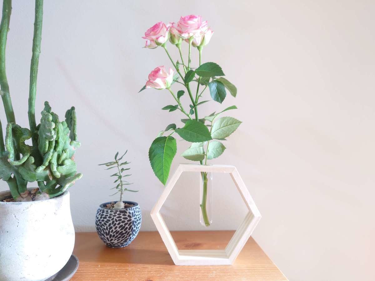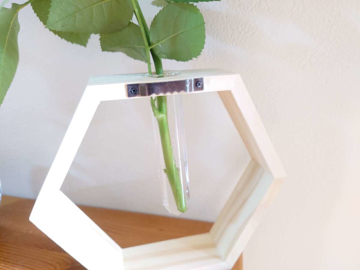 六角型の木枠の中央に試験管が刺さっていて、なんとも可愛い。