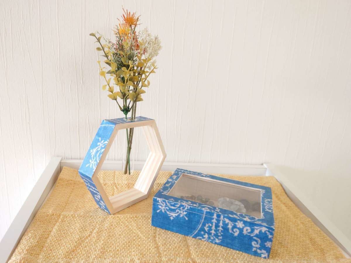 私はクラシカルテキスタイル柄を選んで、一輪挿しとウッドボックスに貼ってみました。