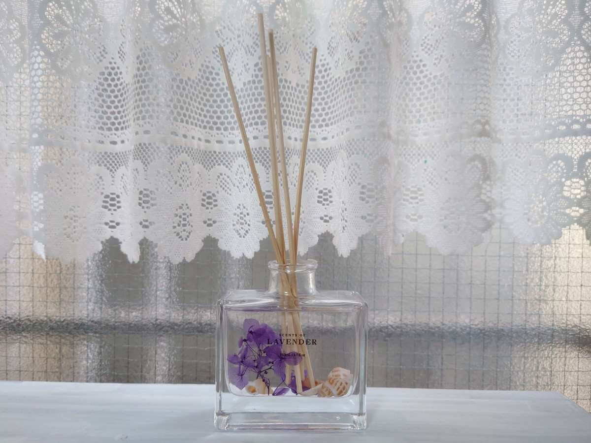 ラベンダーの香りがしっかりするので、部屋中いい香りに包まれ、瓶の紫の花と貝は可愛くてインテリアとしてお部屋のアクセントになります。