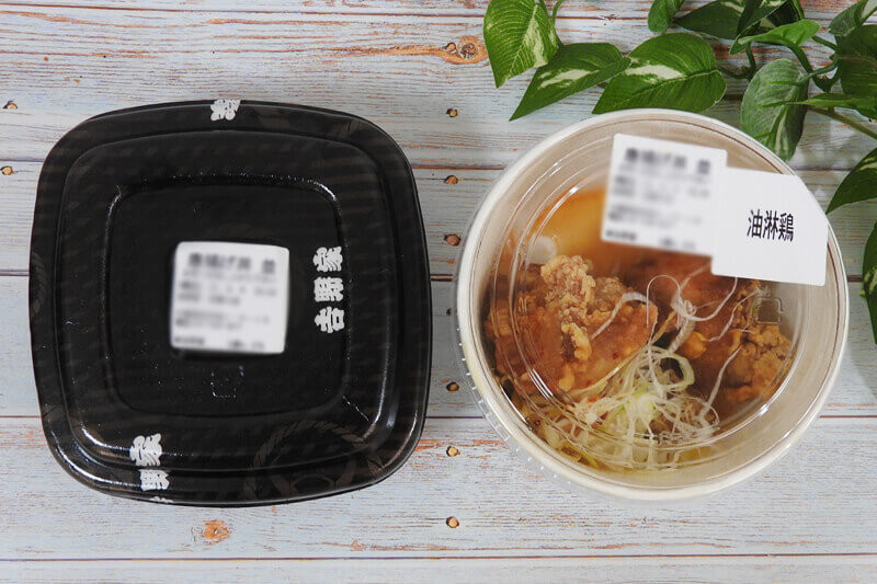 肉厚のから揚げと醬油ベースのたれとねぎをごはんの上にのせて食べる「油淋鶏から揚げ丼」。ごはんと具材は別容器になっていましたよ。から揚げ系メニュー提供店のみの販売です。