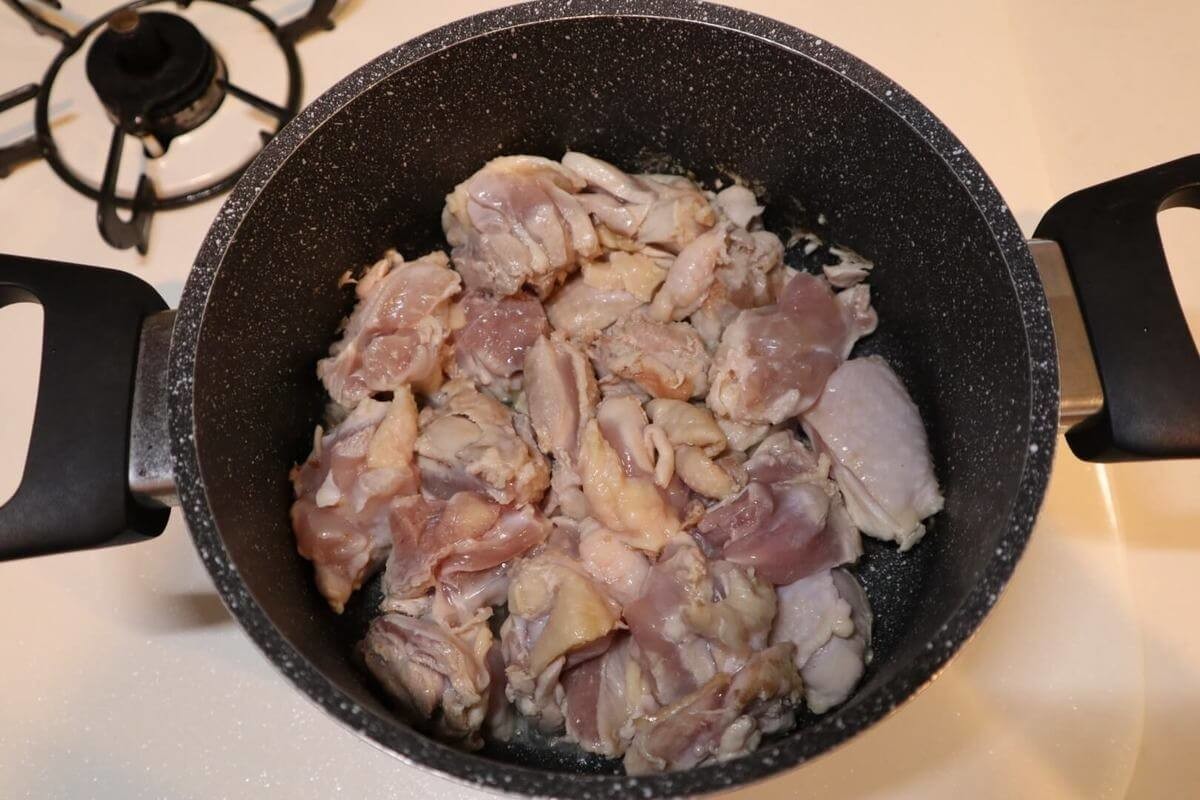 表面に火が入ったら一度取り出します。(公式レシピでは「骨付き鶏もも肉」を使用していますが、今回は鶏もも肉で代用しています。)