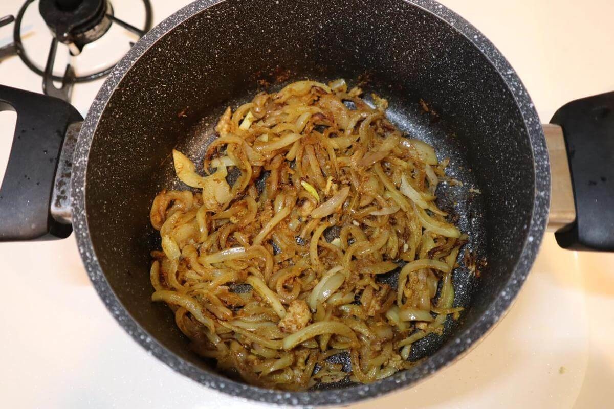 (2)空いたフライパンに油をしき、スライスにした玉ねぎ、にんにくチューブ、生姜チューブを炒めて塩(分量外・少々)、カレー粉(大さじ2)、シナモンパウダーを加えます(今回レシピでは「スティックシナモン」を使用していますが、今回はシナモンパウダーで代用しています)。