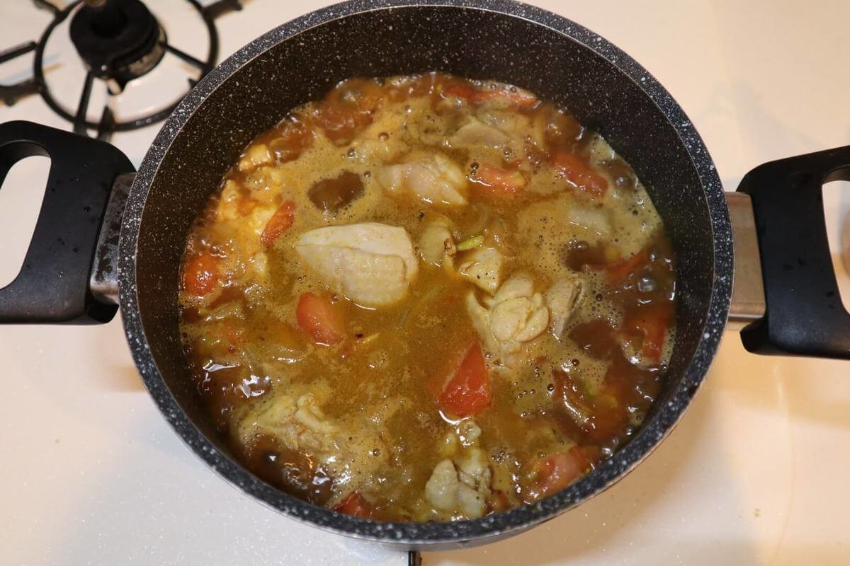 (3)鍋に、(1)(2)、ざく切りしたトマト、水を入れて火にかけ、アクを取って中火で20分くらい煮込みます。
