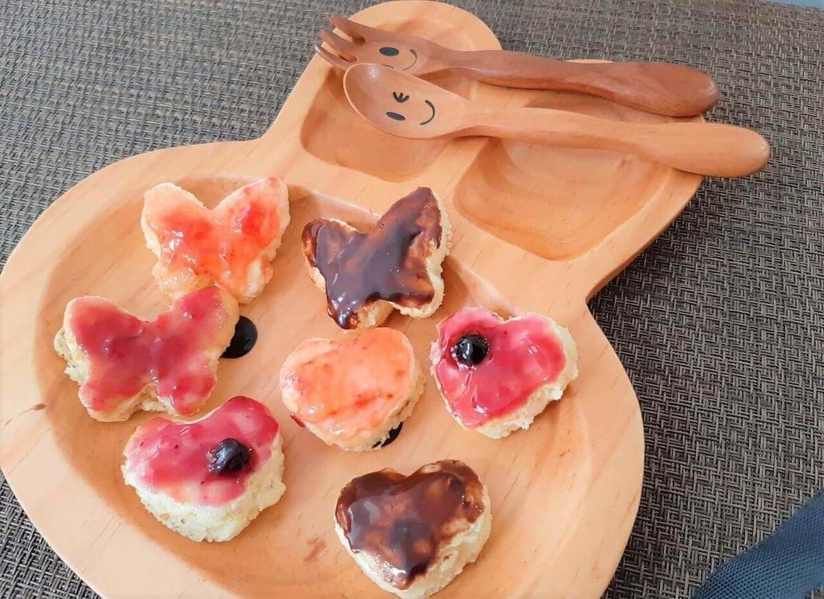 我が家では食パンが朝食のとき、こんな風に型抜きしてジャムを塗ると子どもが大喜び。