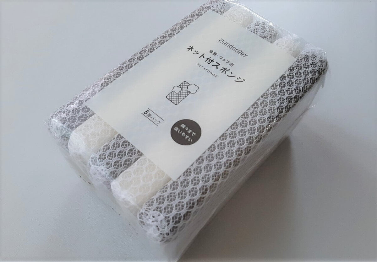 白と黒のシンプルなネット付きスポンジです。 5個入り78円…!1つあたり約15円とかなり破格のお値段です。
