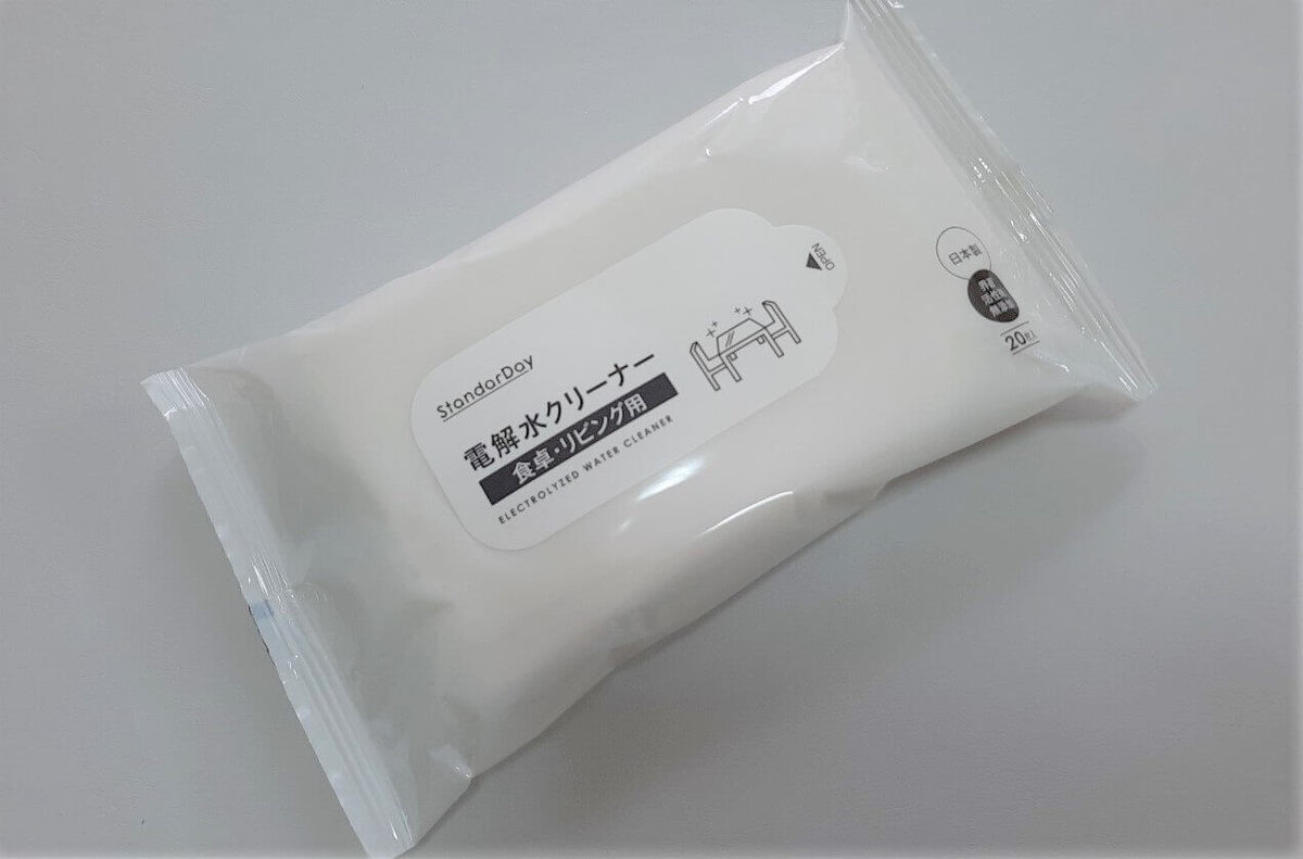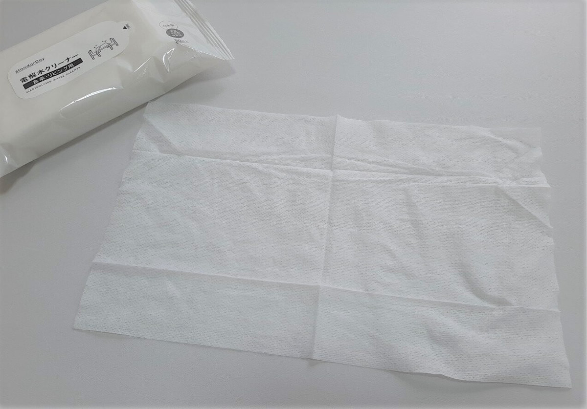 我が家はテーブル拭きをおいておらず、いつもこのクリーナーで拭いています。 おすすめポイントは丁度良い厚みと、しっかり拭き取れるほどよい水気。 アルカリ電解水・発酵エタノールを含んでいるそうです。