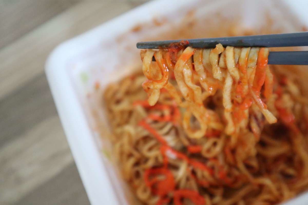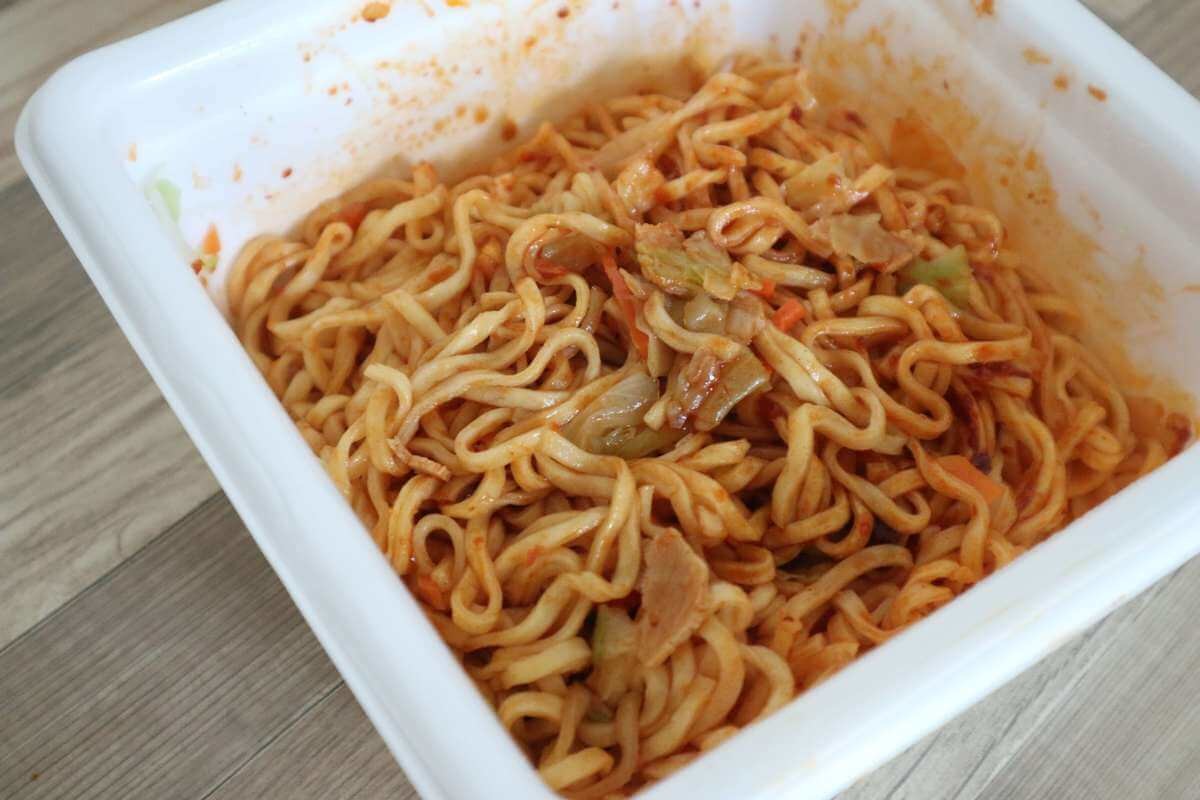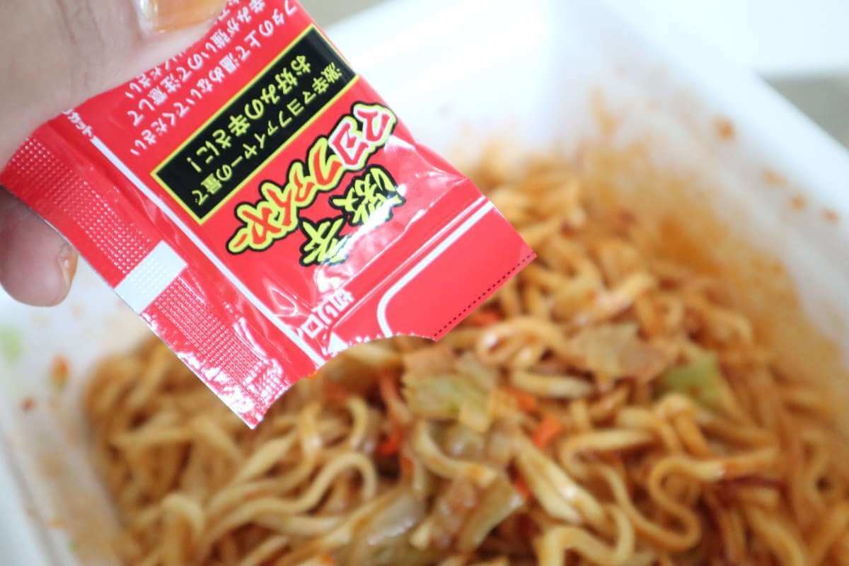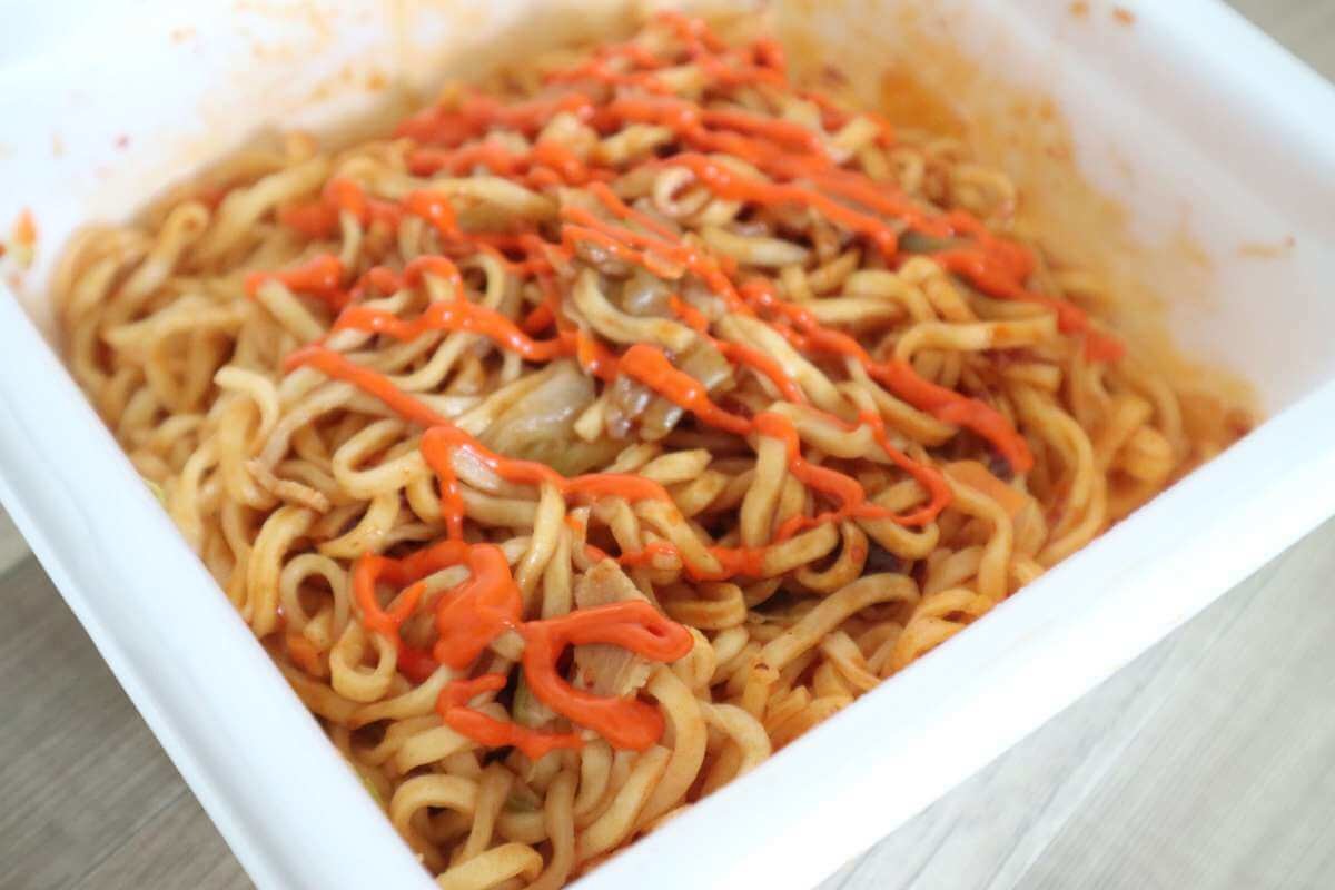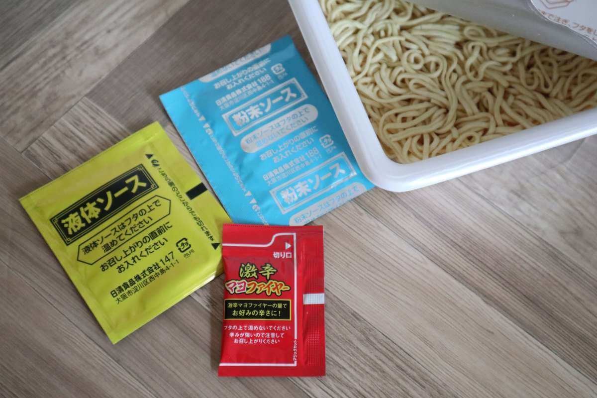 麺はフライ麺、粉末ソース、液体ソース、そして激辛マヨファイヤーが入っています。