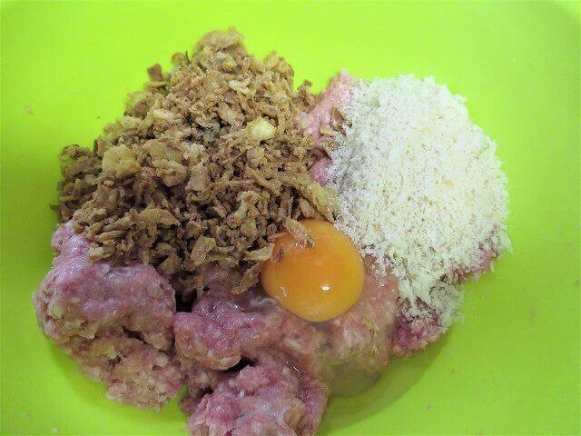 肉だねには、塩コショウのみの味つけですが、クリスピーフライドオニオンに塩分があるためか、とっても深みのあるいいお味になります。
