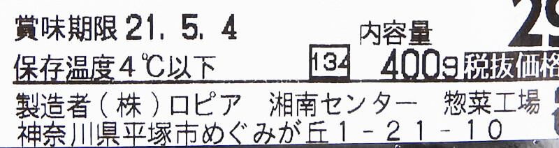 「ロピア自社製」と書かれているシールが印象的なロピア「自家製ナゲット(ポーク&チキン)」。ロピアの湘南工場で製造されているロピアオリジナル商品です。ナゲット400g入っており、321円(税込)という価格はそこそこお安いと思いました。