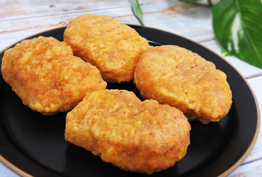 一口食べてみると、ハムのような練り物っぽい食感がします。チキンナゲットと思って食べると、期待外れに感じるかも。商品名をよくよく見ると(ポーク&チキン)ですものね。