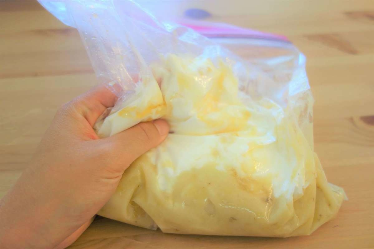 バナナアイス作り方②ヨーグルト・はちみつを加えて揉んで混ぜる