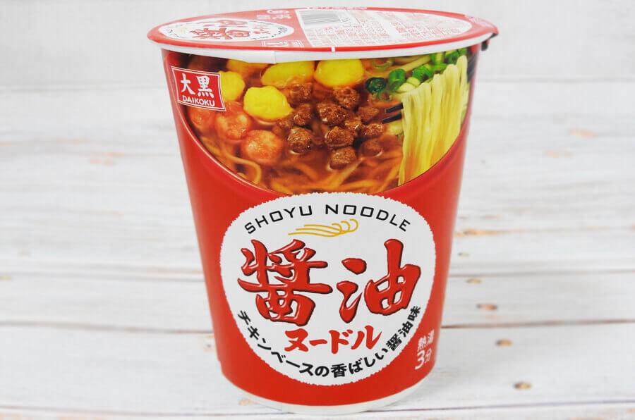 最後に、王道のカップ醤油ラーメンをいただきます。大黒食品工業「醤油ヌードル」74円(税込)は、チキンエキスと香味野菜で仕上げたスパイシーな醤油味とのこと。