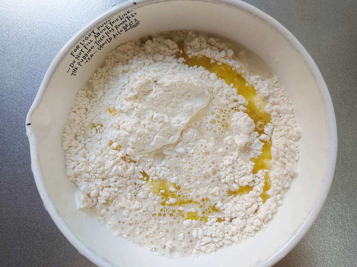 ボウルにミックス粉(300g)を入れ、水180cc、サラダオイル大さじ1(15cc)を入れ混ぜ、ねばりが出たら30分〜1時間寝かせます。