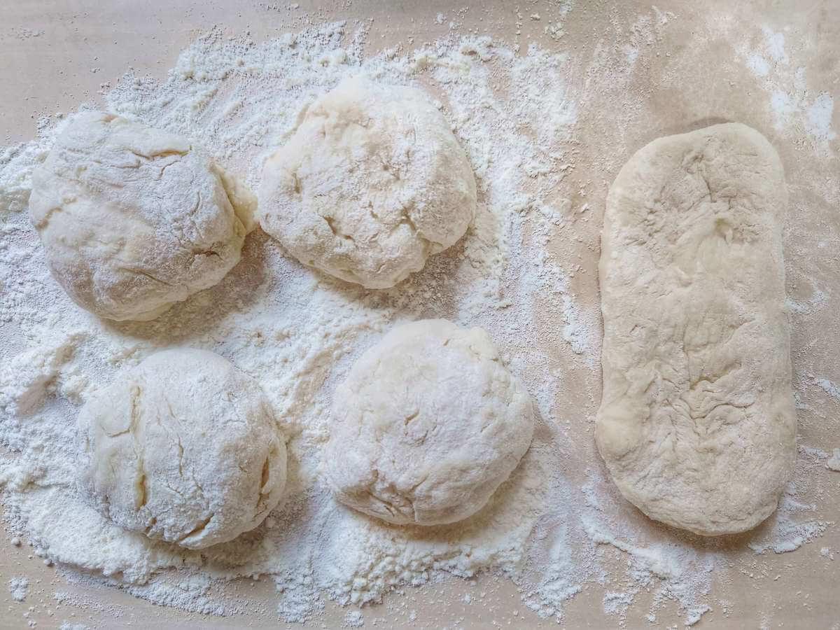 寝かせた生地を4、5等分にし5mmの厚さに手で伸ばします。この時、打ち粉(小麦粉)をまぶすとやりやすいです。めん棒で伸ばしてもOKです。