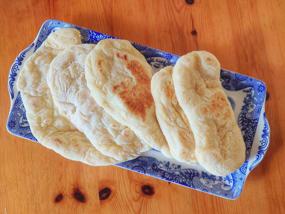 5枚分作り、焼き上げました。成形の容量がわからず色々な形になってしまいましたが、中はもっちりしていてカレー屋さんのナンと遜色ない味になりました!