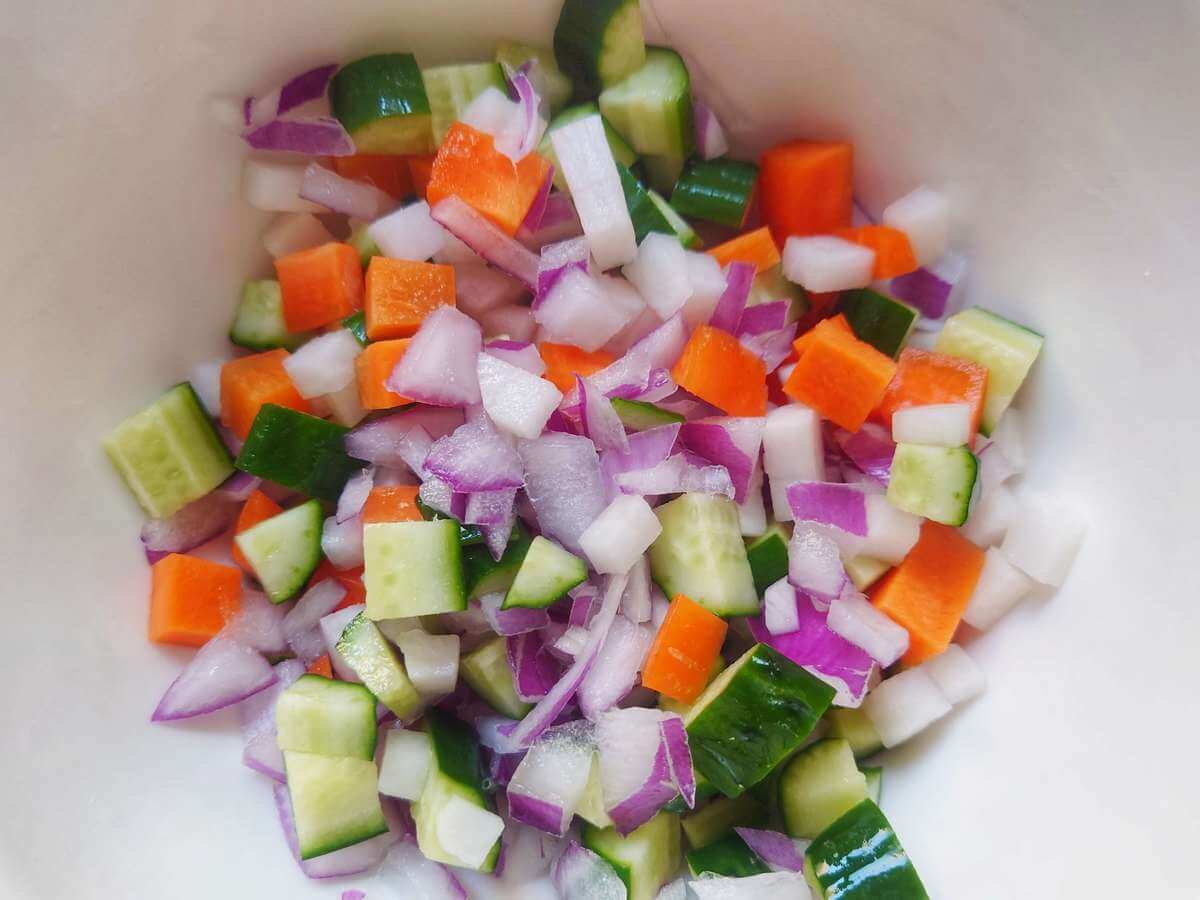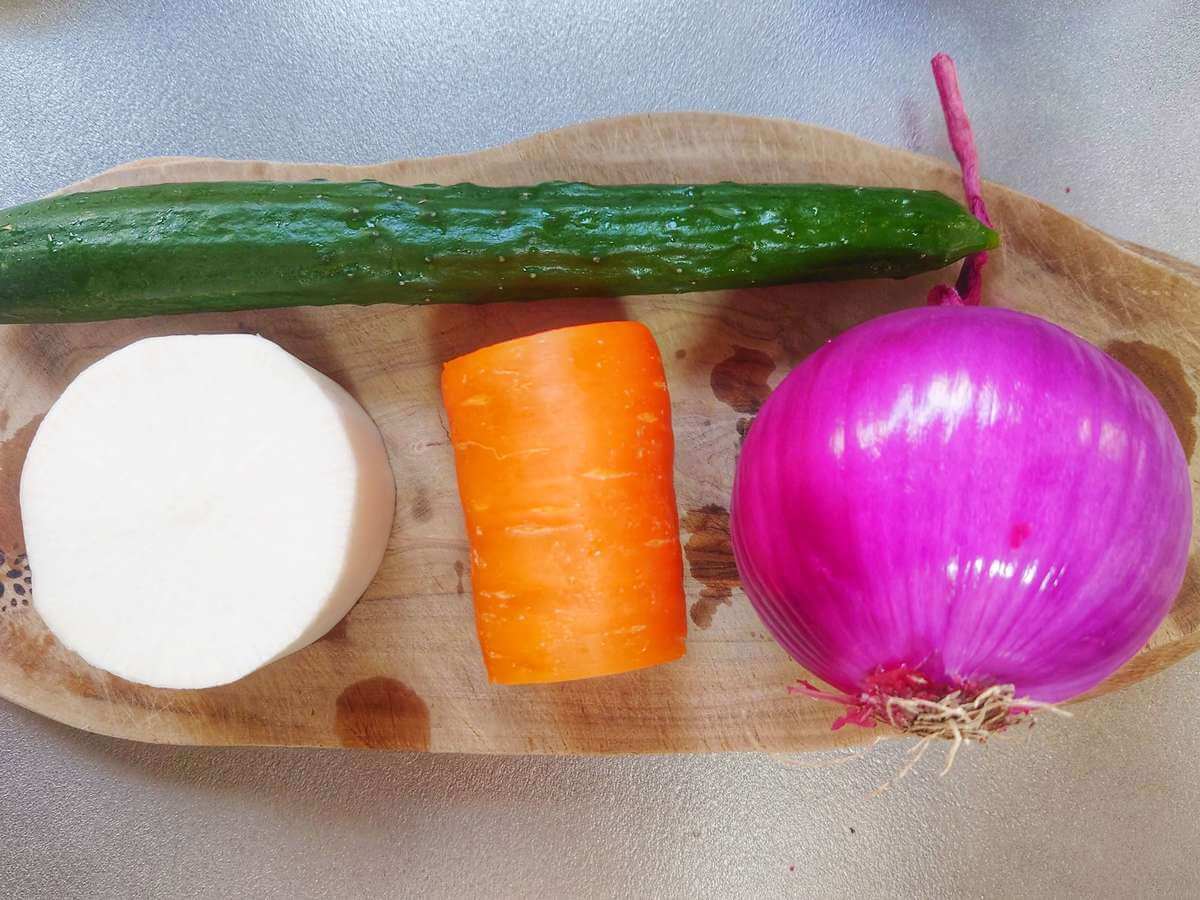 野菜は家にあるものを使いました。今回使ったものは玉ねぎ1個、にんじん¼本、大根約4センチ、きゅうり1本です。これで4人前以上のアチャールができます。