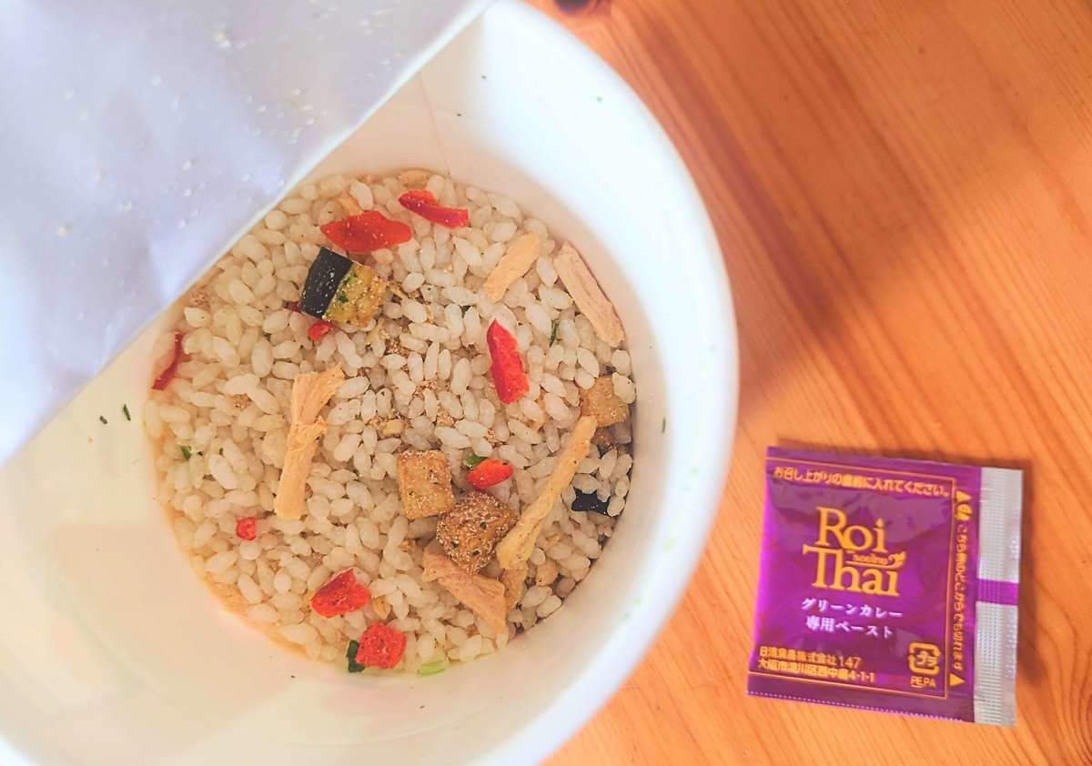 お湯を注いで5分待ち、蓋の上に付いている小袋のペーストを入れて混ぜれば、簡単にグリーンカレーを食べることができます。香辛料の香りが食欲を刺激します!