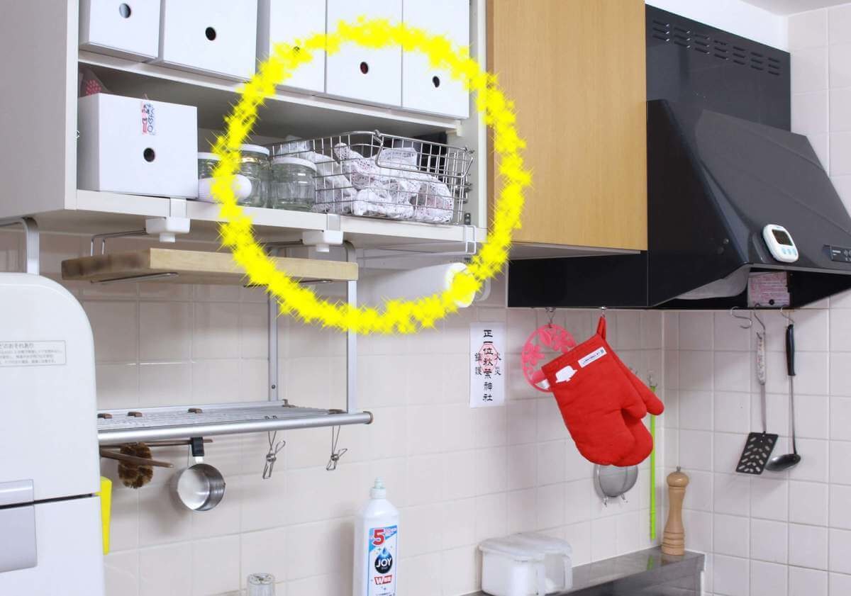 流し台のちょうど上にふきんを収納しています。