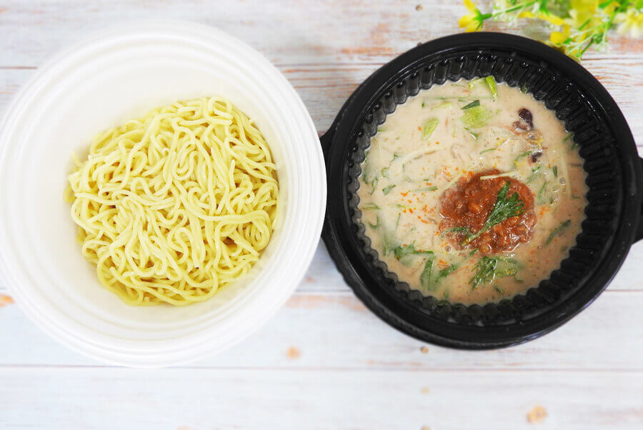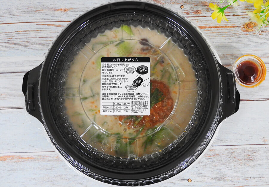 - 2.のふたを取り、麺の上に黒容器に入っている具材やスープを流し込んだら完成