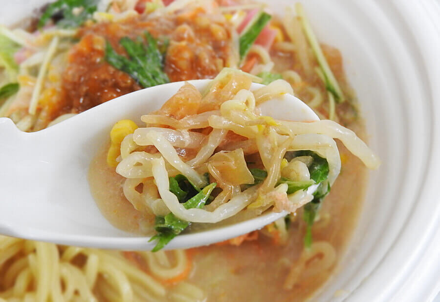 レンゲでスープ内をすくってみると、水菜やもやし、コーンなどが写真くらいにはとれます。