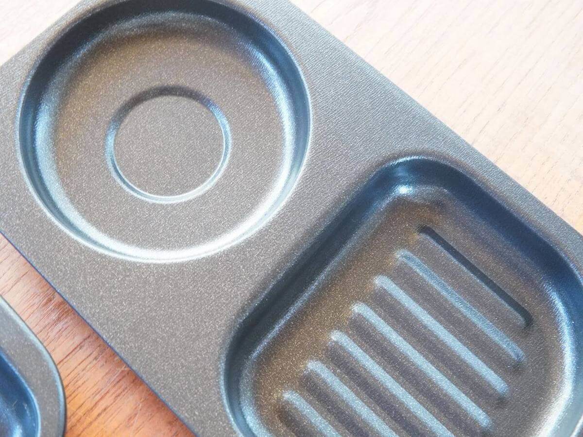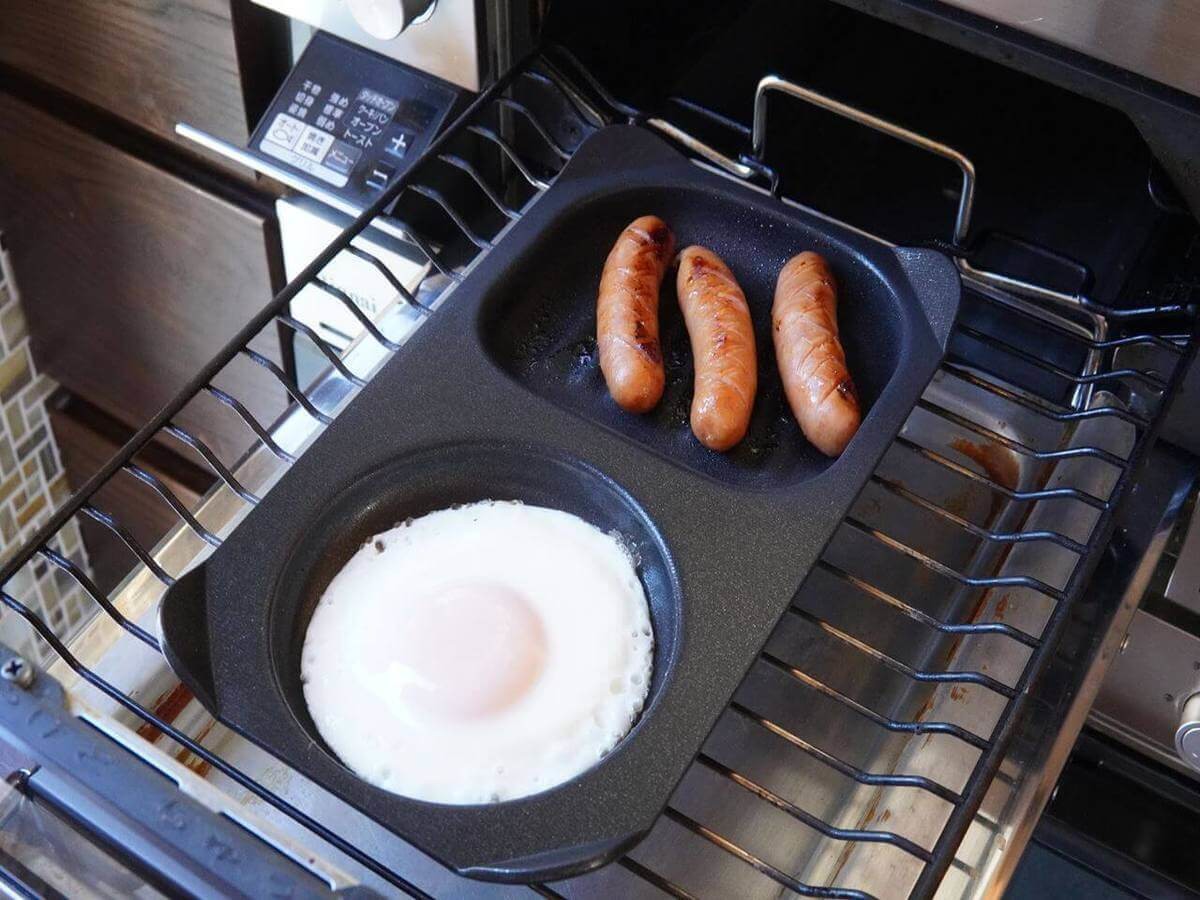 トースターや魚グリルにプレートを入れて焼くだけで、パンと同時におかずのウインナーや目玉焼きもでき、調理の時短に!