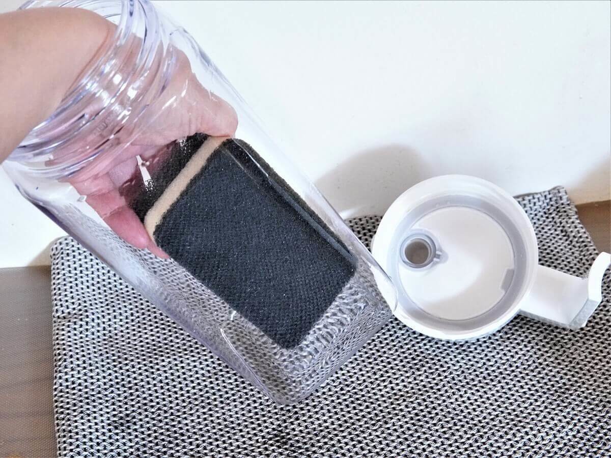 フタはパッキン一体型、ボトルの口も広いので、手を入れてスポンジでしっかり洗いやすくてお手入れも楽です。