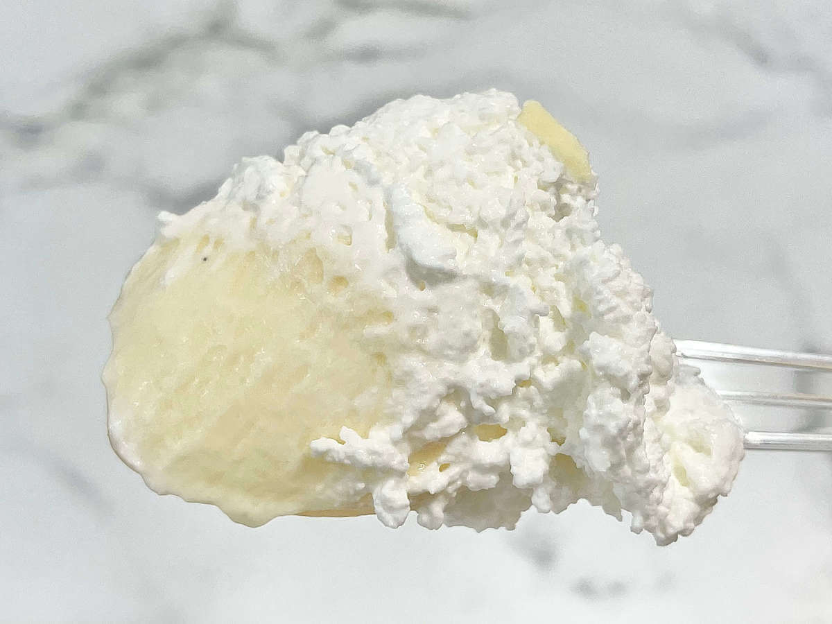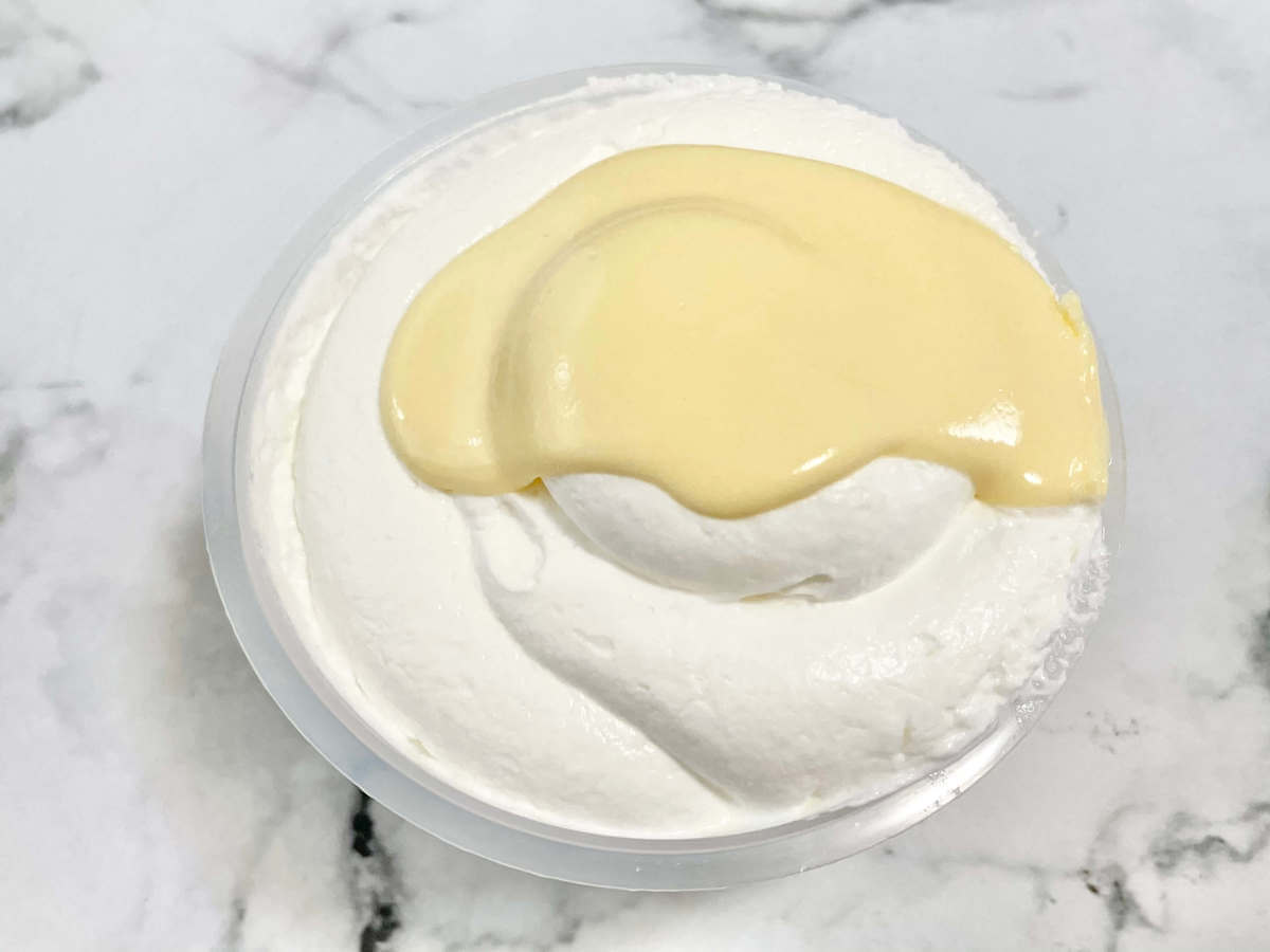 フタを開けてみると、モリモリに盛られたチーズホイップクリームが食欲をそそります。