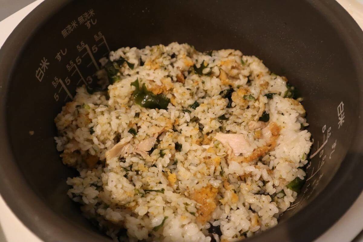 炊きあがったら、ファミチキを切るようにかき混ぜて完成です。