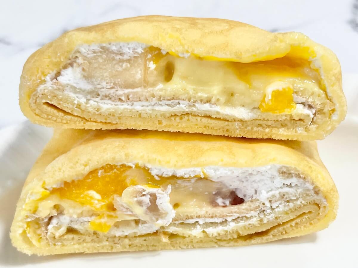バナナ、苺、黄桃、パインの4種類のフルーツが包まれたクレープです。