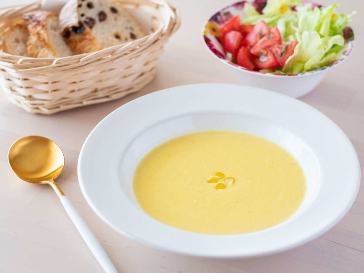 温かいコーンスープにおいしいパンとサラダを添えて、ホテルのモーニングのような朝ごはんを用意してみました。