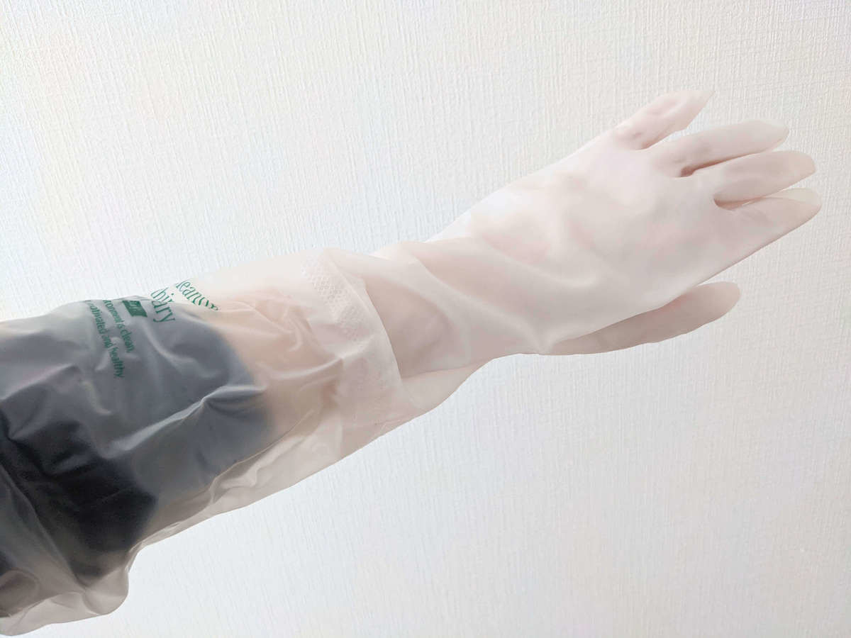 このゴム手袋の特徴は、ロングタイプで肘まですっぽりカバーしてくれること。 長さが足りないと水が入ってきやすいですが、ここまで長いと安心して作業できます。
