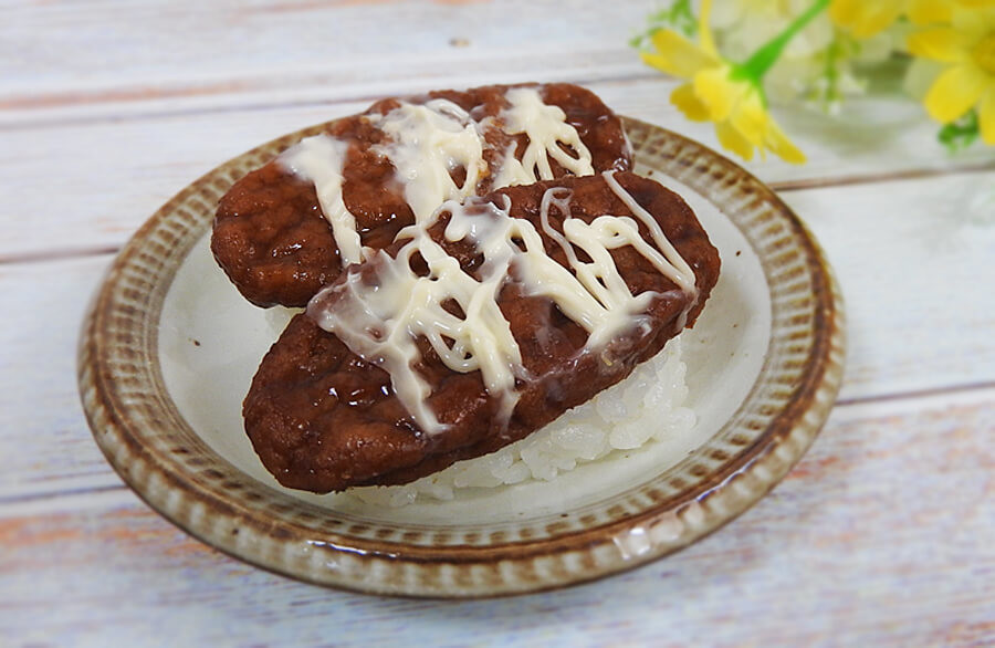 俵型のハンバーグにマヨネーズがかかっています。本来であれば、もっときれいにマヨネーズがかかっているはずですが、持ち帰りしている間にぐちゃぐちゃになってしまいました。持ち運び難易度が高めですね。