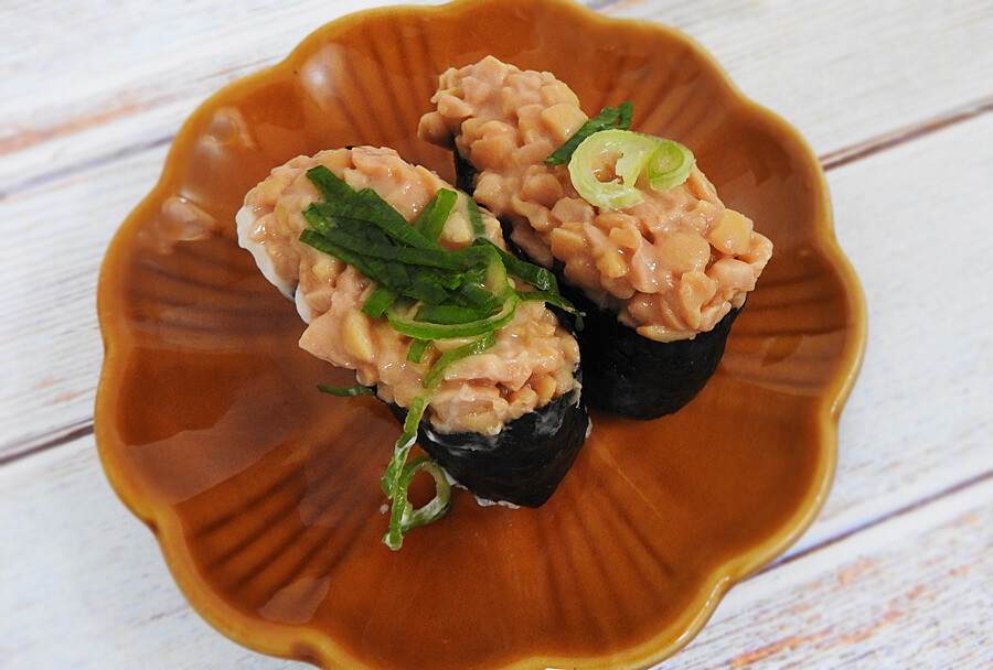ひきわり納豆とねぎがトッピングされている軍艦。子ども達からは「ねぎの苦みがきつい」という声が聞こえてきましたので、一生懸命ねぎを取ってから手渡すはめに……。