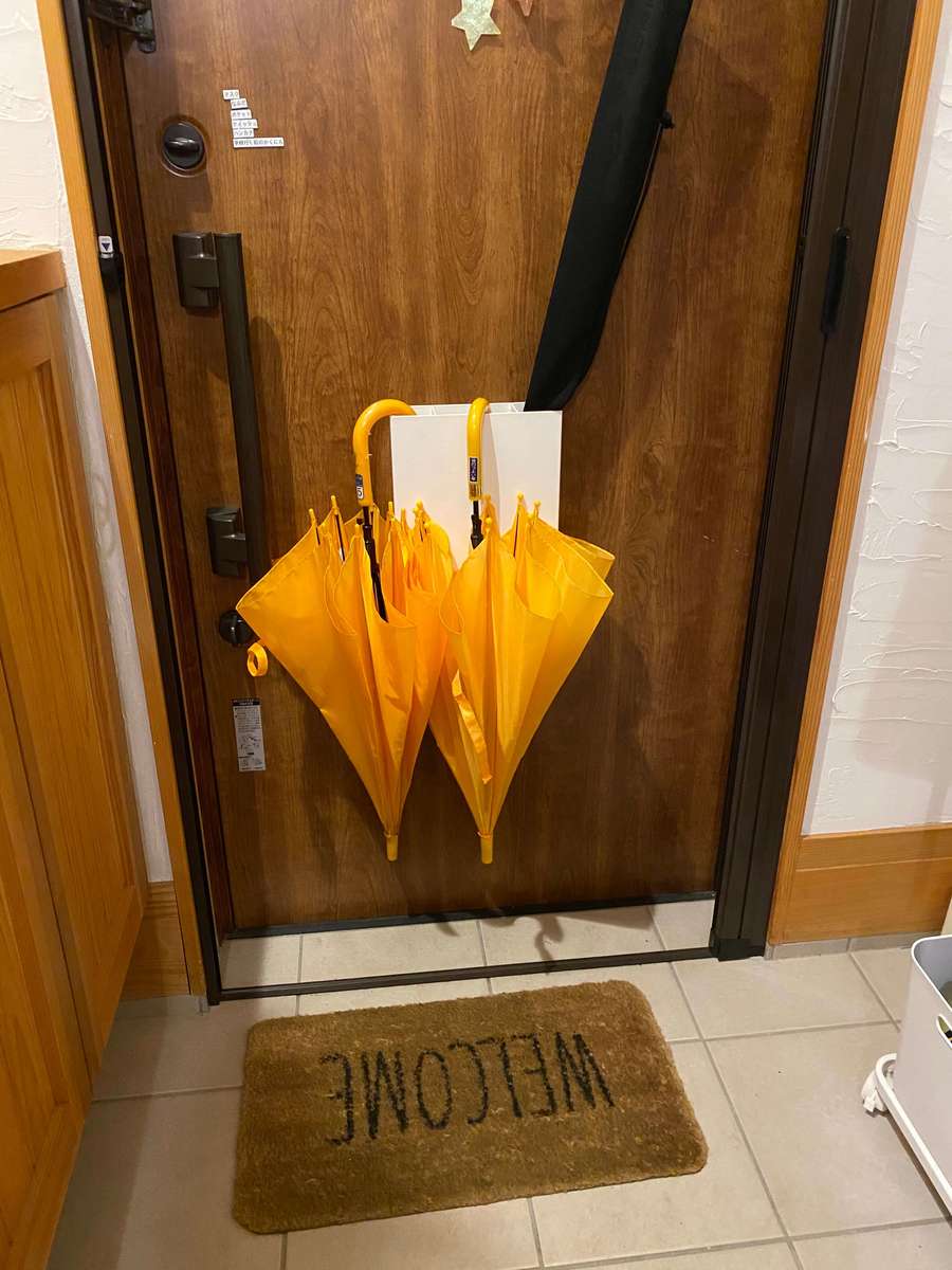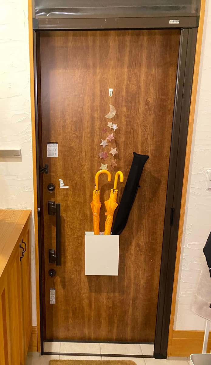 うちの玄関ドアはマグネットがくっつくので、傘を浮かせる収納にしています。