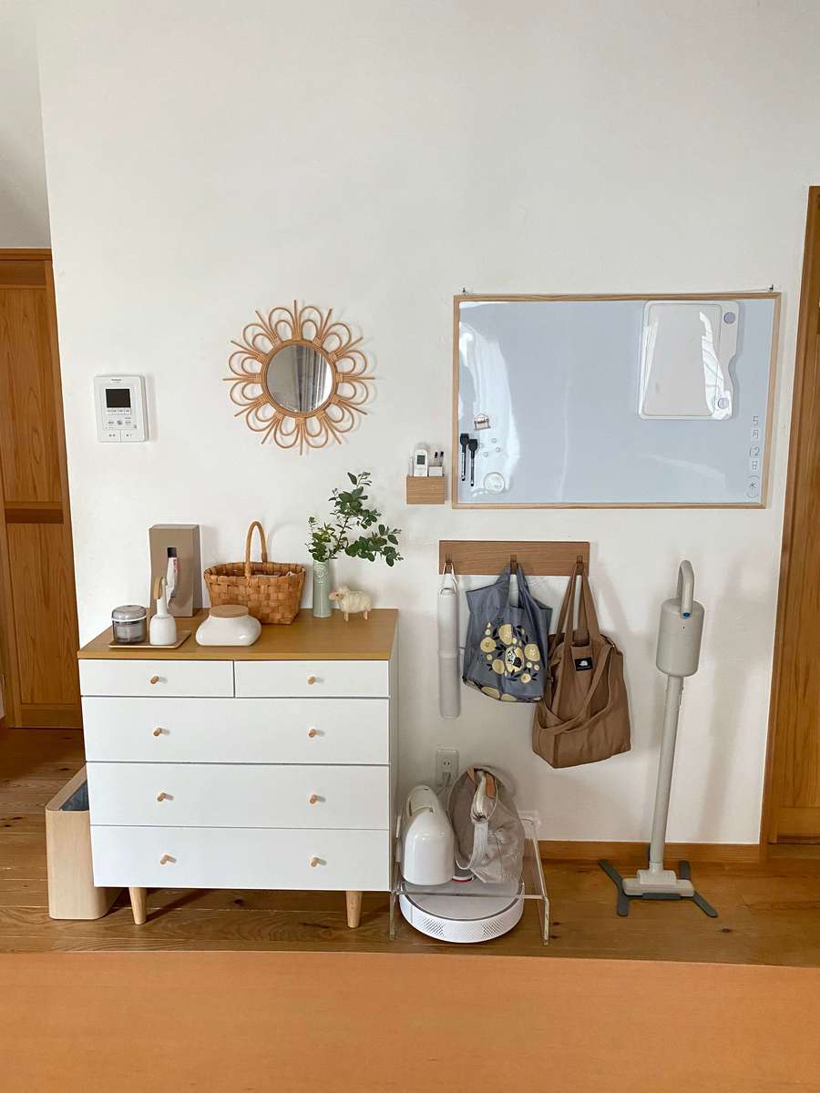 細々した物が増えても、浮かせられるものは浮かせて、お掃除の手間を省きたいものです。 鍵なども壁面にフックを取り付ければ、浮かせて収納できます(我が家ではマグネット収納にしています)。