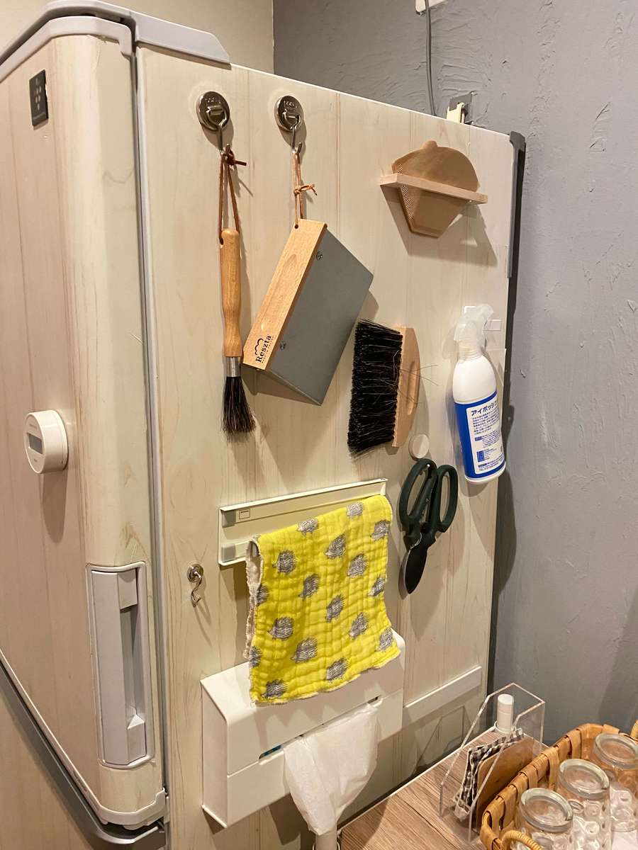もちろん冷蔵庫横も余すところなく収納に使っています。 スプレーボトルやふきんなども、マグネットで収納できるものを選べば、収納の幅が広がります。