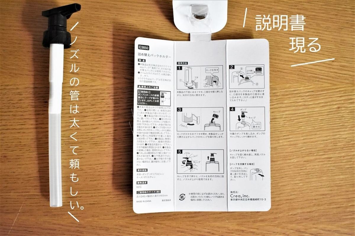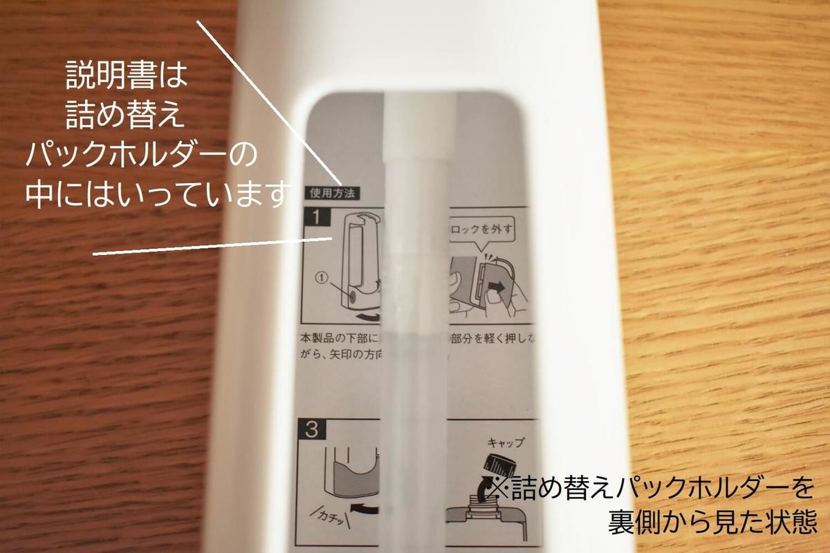 この詰め替えパックホルダーは、セットの仕方にコツや順番があります。しかし見てのとおり、その説明書は、買った後中から取り出さないと見られない状態です。