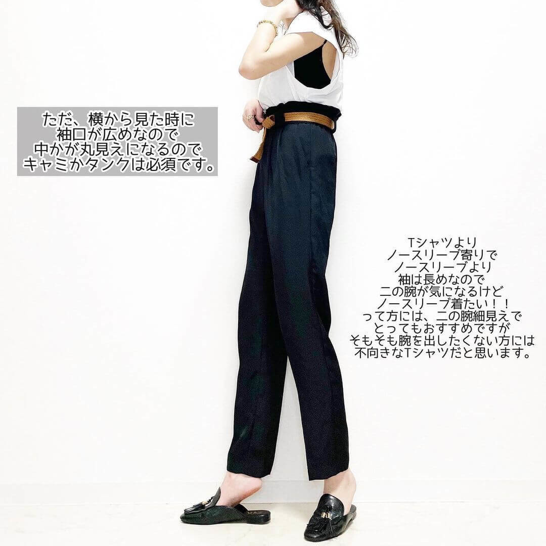 二の腕をカバーしてくれて一枚でも着映えするTシャツなので、イロチ買いでストックしておいても重宝しそうですね。