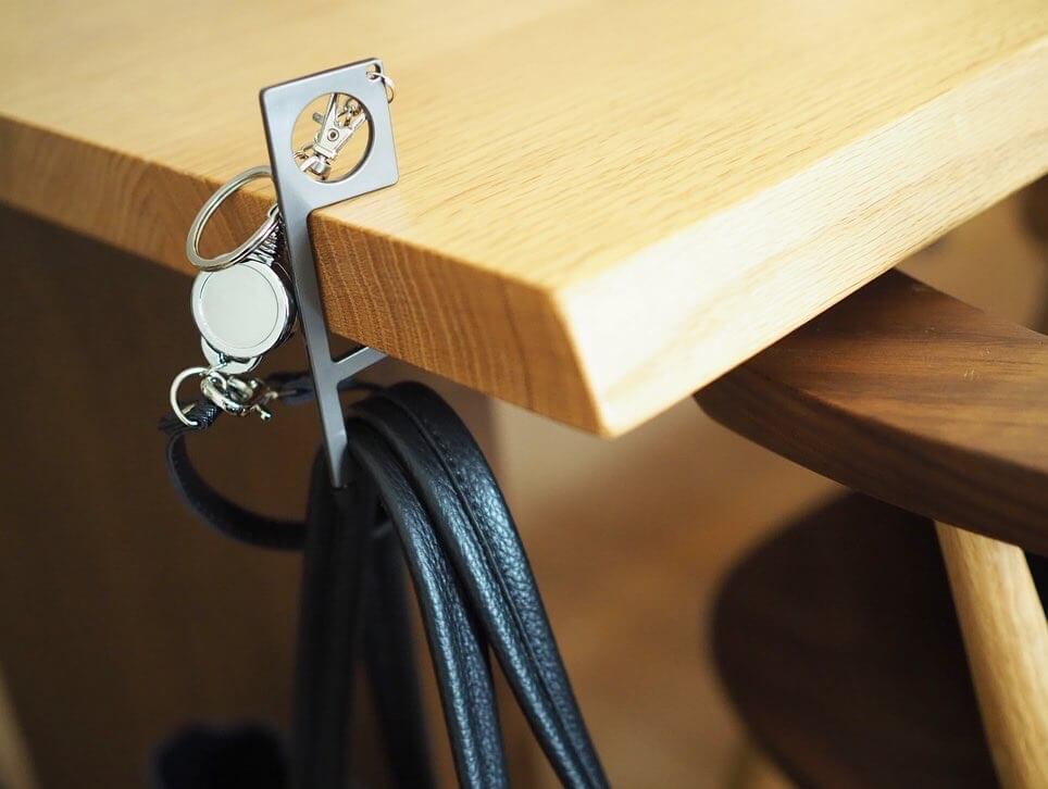 こちらは鞄を床に置かずにテーブルに引っ掛けられる「バックハンガー」としての機能もあるんです!