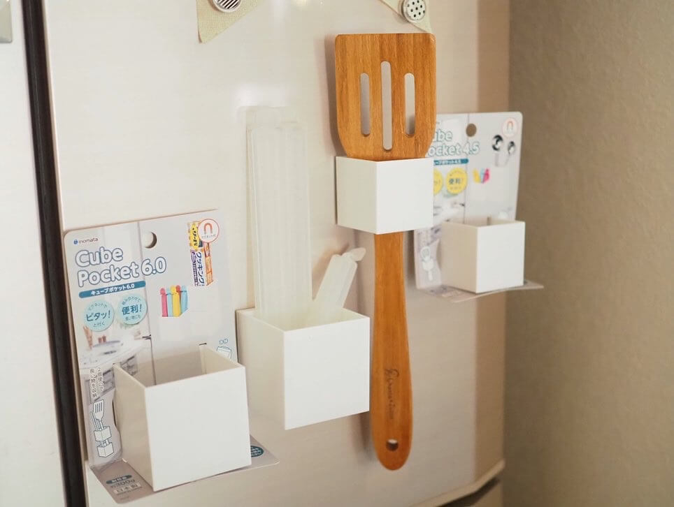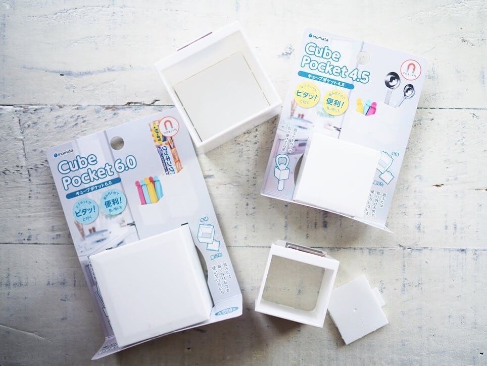 シンプルなキューブ型の収納ケースに見えますが、裏面はマグネットが付いているので冷蔵庫や玄関ドアにくっつけることができるんです!