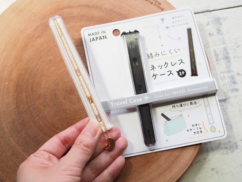 スリムな収納ケースにセットしておけば、チェーン同士が絡まずに保管できるのでネックレスがすっきり収納できるんです。