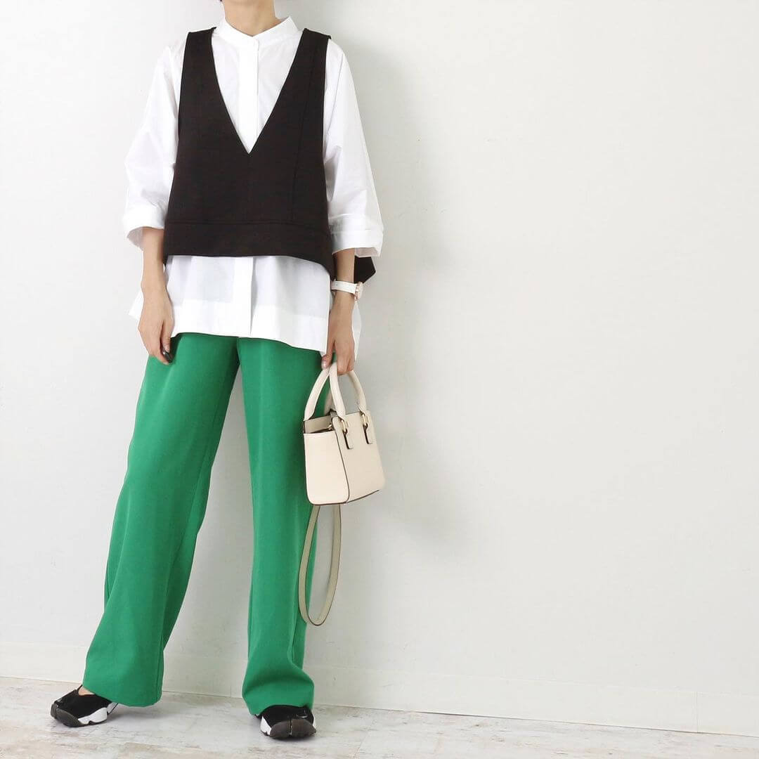 160cmでサイズ Lを着用しています。 黒のVネックベストをレイヤードして、鮮やかなグリーンパンツをオン。