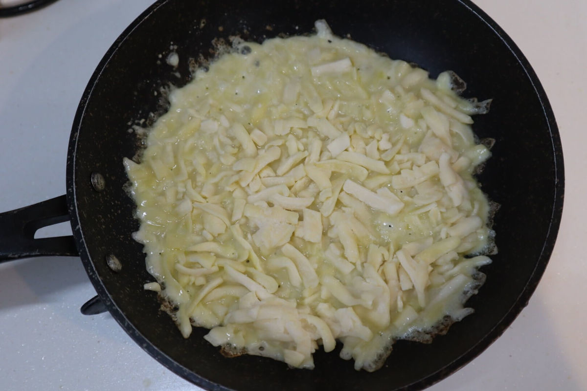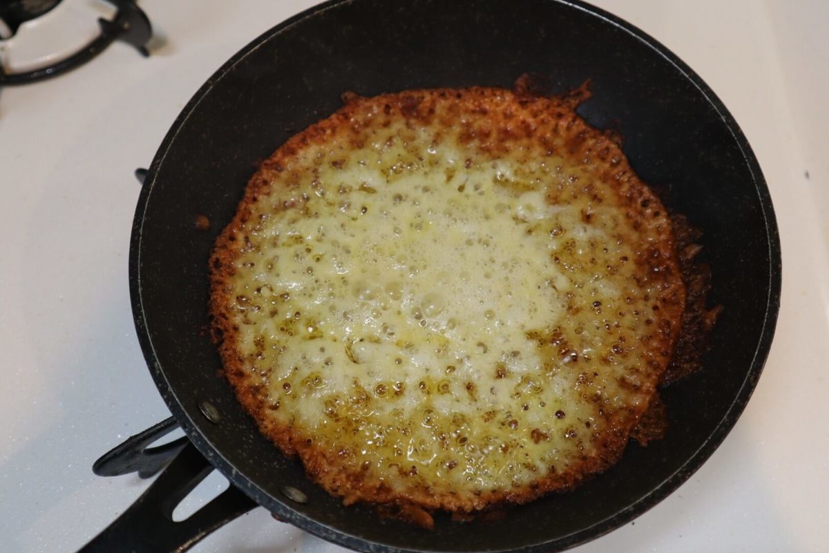 熱したフライパンにピザ用チーズをしき、カリッとするまで弱火から中火で2~3分焼きます。