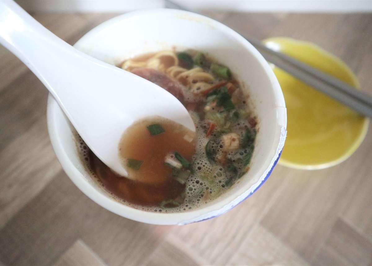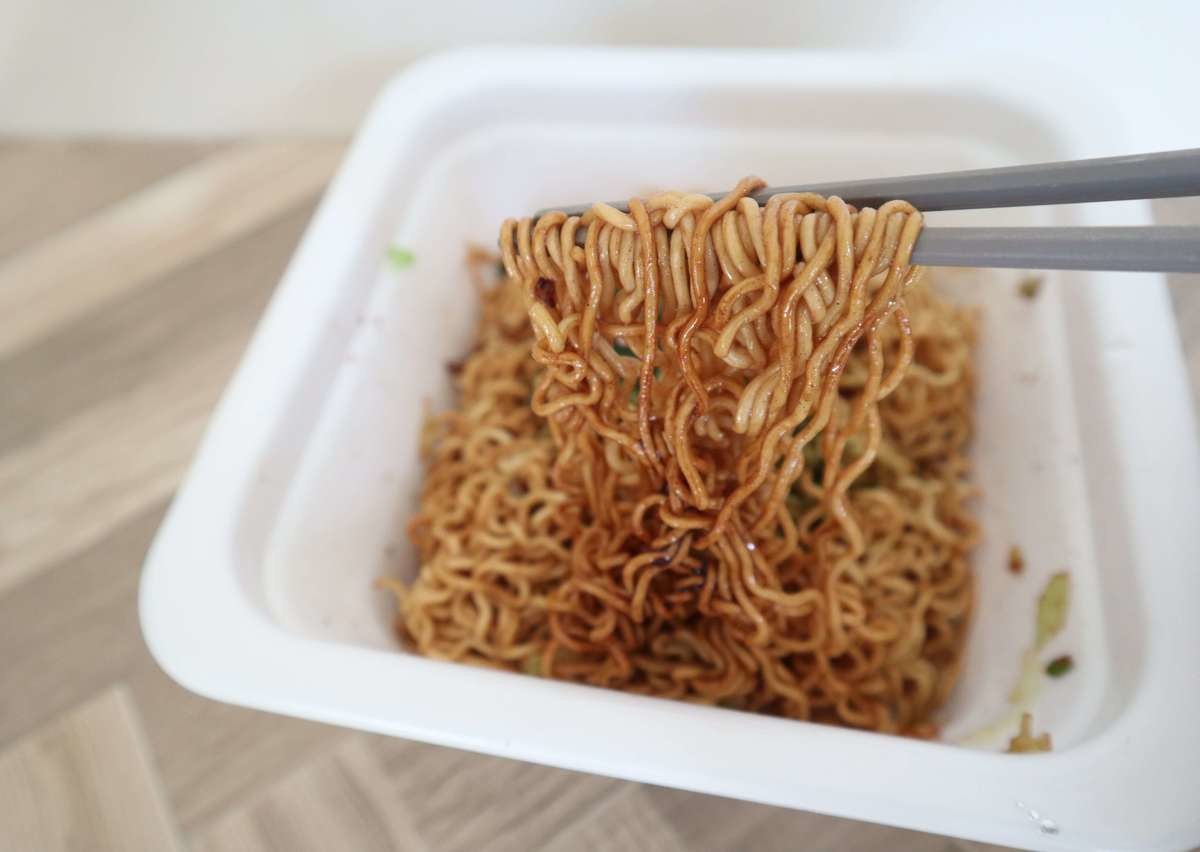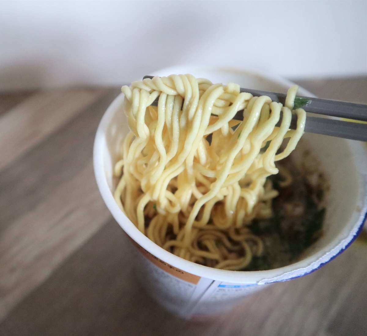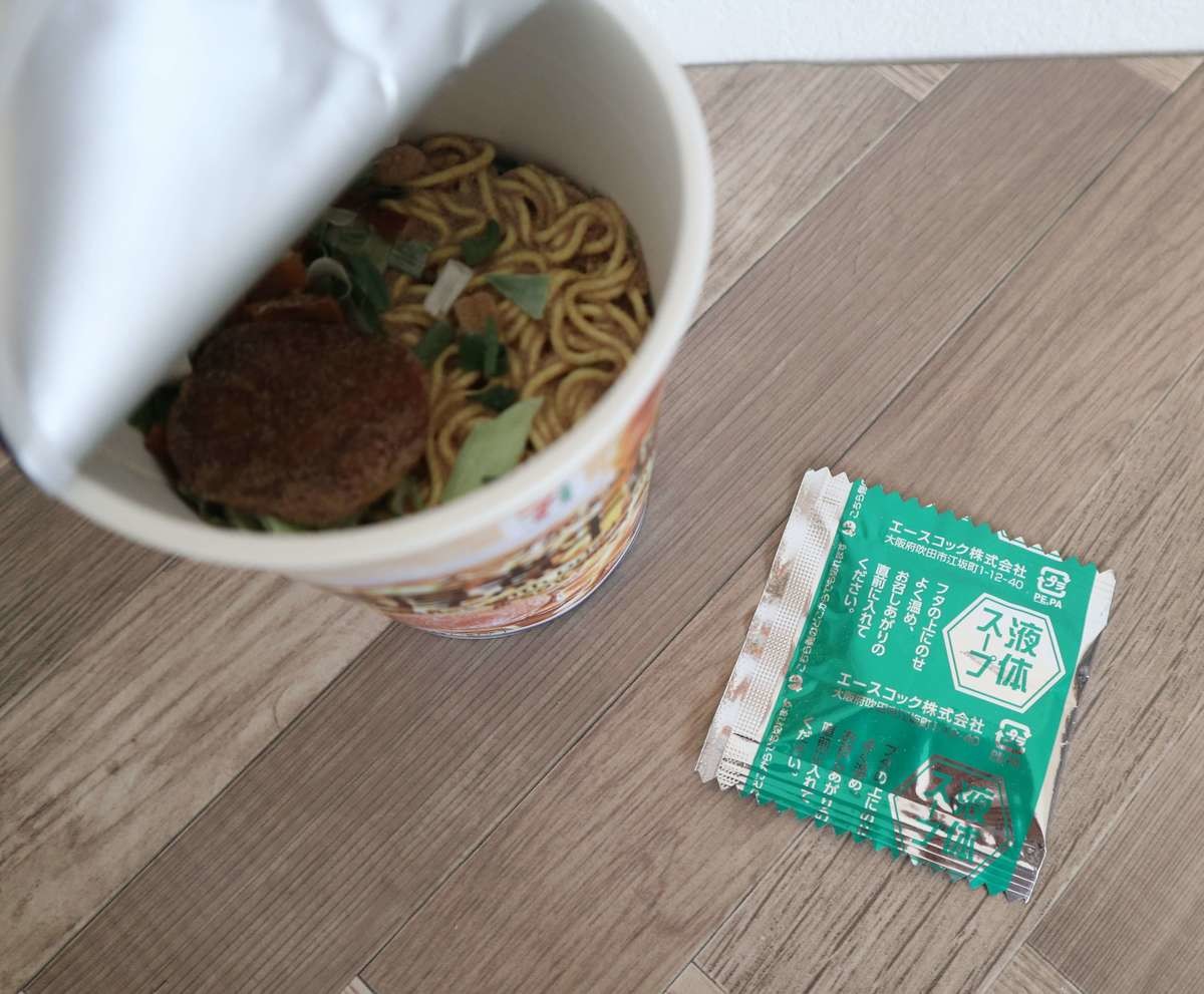味は濃厚な甘めのソースで食欲をそそります。 麺は、一般的なカップ焼きそばより細め、そしてちょっとかためかな。やっぱり1分だとちょっと厳しいのかなというのが本音です。