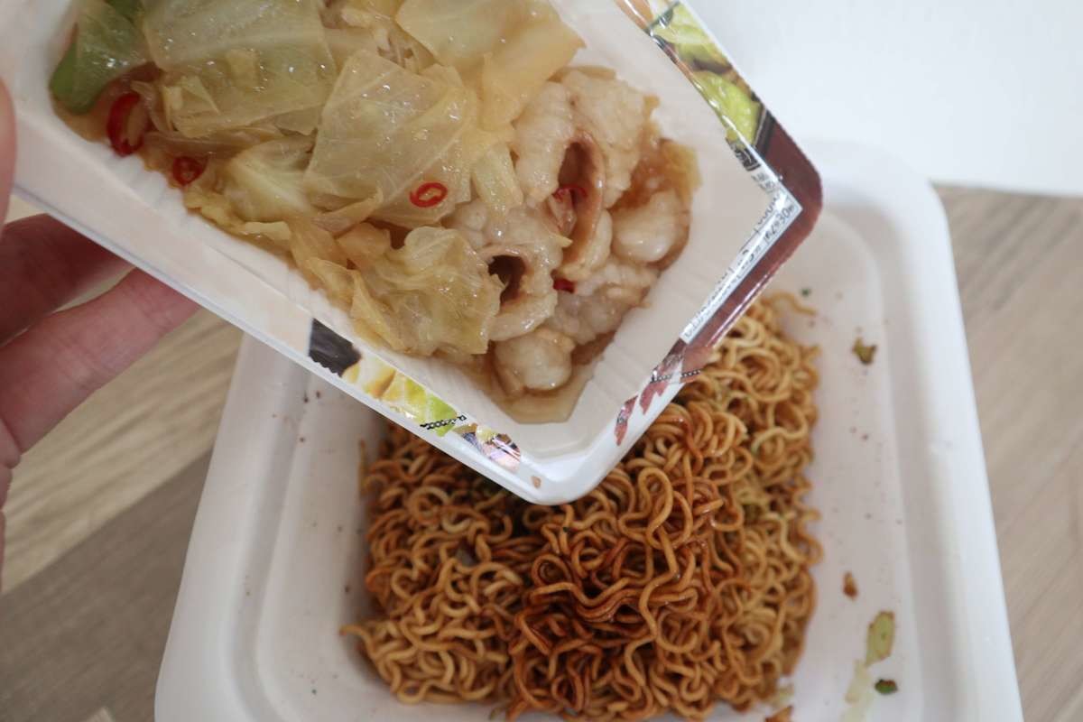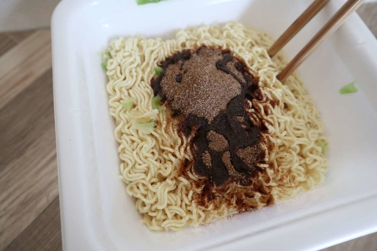 1分湯戻ししたら粉末ソースと特製油を加えて混ぜます。 一般的なカップ焼きそばよりほぐしにくいのでちょっと時間がかかります。