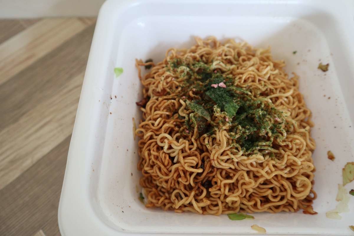ソースがまんべんなくい混ざったらふりかけをパラリ。